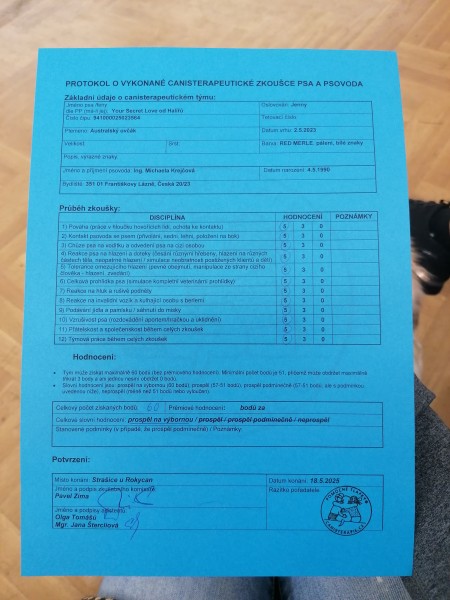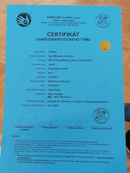 Aktivní canisterapeutický pes, zkoušky 18.5.2025 u organizace Pomocné tlapky